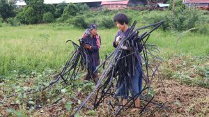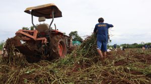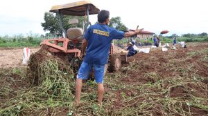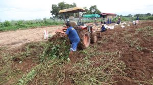 เนื่องจากเป็นฤดูเก็บเกี่ยวผลผลิตริมมูน นั่นก็คือ หัวมันม่วง ประเภทมันสีม่วง ในพื้นที่ราวๆ 20 กว่าร่องทำอย่างไรถึงจะออกหัวได้ดี(เป็นการดำริของทีมปลูกมัน) เป็นการเรียนรู้การปลูกมัน ระหว่างมันสีส้ม45 มันสีม่วง120 วัน พอดีรับประทานกันทีเดียว แมลงก็ยังไม่มากิน เรียกว่า แมงยังไม่มากิน ถ้าหัวมันเลยอายุไปก็จะมีแมงมากิน หัวก็ได้รับความเสียหาย ครั้งนี้มันออกลูกได้ไม่ถึงกับร้อยเปอร์เซ็นต์แต่ก็ถือว่าได้ผลดีพอใช้ แต่ยังไม่ดีมากเท่าที่ประสบการณ์การปลูกมัน อย่างน้อยก็มีไส้เดือนไขดิน พื้นดินช่วงนี้ก็จะแฉะอยู่บ้าง เพราะฝนตกมาเป็นระยะ วิธีเก็บก็ตัดยอดออกก่อน ใช้รถไถเกี่ยวสาวก้านเถามันออกก่อน ทิ้งให้ดินยุบตัว เก็บสายยางออก ค่อยทำการไถขุดแนวร่องให้หัวมันออกมา ก่อนปลูกได้มีการวางระบบสายน้ำหยด ประหยัดน้ำ ควบคุมความชื้นในดินให้พอเหมาะ ซึ่งวันนี้ก็มีการลงแขก ร่วมด้วยช่วยกันเก็บหัวมันกันอย่างคึกคักเลย นำผลผลิตที่เก็บเข้าครัว บนเรือ สำรองเพื่อแจกจ่ายแบ่งปันแต่ละช่วงเวลาต่อๆไป เป็นงานสาธารณโภคี