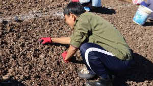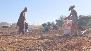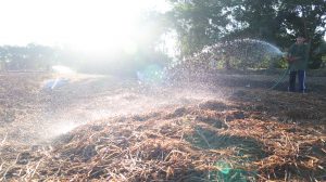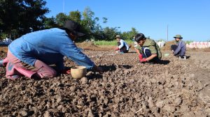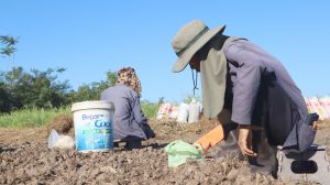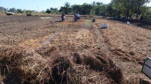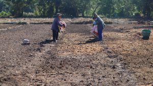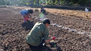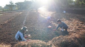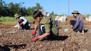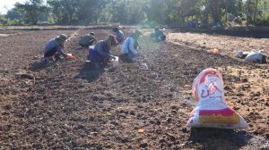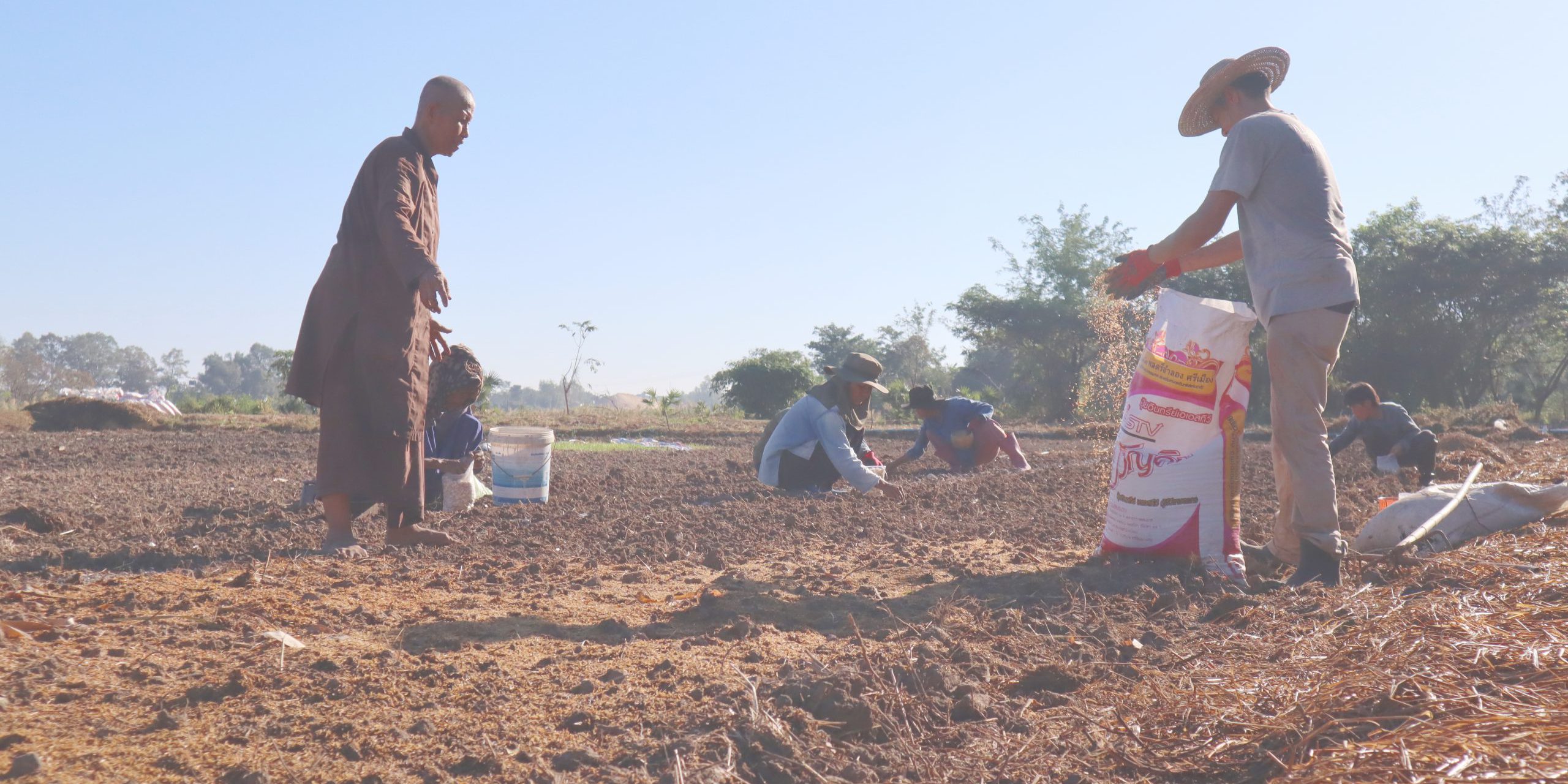 เช้าวันที่ 19 พฤศจิกายน 2563 ที่บริเวณลานกราบ ตรงทางสู่เมรุเฮือนสุดชีวิต จะอยู่ฝั่งซ้ายมือ ก็จะสังเกตเห็นว่าบริเวณพื้นที่นี้ เป็นแปลงนาปลูกกำลังแรงคนเป็นหลัก เน้นการทำการเกษตรแบบดั้งเดิม ปรับปรุงสภาพดินให้อุดมสมบูรณ์ ในรูปแบบการบริหารการจัดการ นำโดยสิกขมาตุเป็นหญิง อโศกตระกูลและทีมงานกสิกรรมไร้สารพิษราชธานีอโศก ท่านจะดูแลดินด้วยการใส่ปุ๋ย แกลบดิบ หัวเชื้อปุ๋ย ขี้หมู ปุ๋ย ฯลฯ ก่อนที่จะลงพืชผักต่างๆ ครั้งนี้ได้หมุนเวียนการปลูกกระเทียมพันธ์ุพื้นบ้านจากจ.ศรีษะเกษ มาบริโภคใช้ในชุมชนบ้านราช และเผื่อแบ่งปันพี่น้องต่างบวร จึงได้ระดมเรี่ยวแรง จากพี่น้องในชุมชน ซึ่งเรียกว่ากลุ่มงานนิสิตวนบ. และจิตอาสา เท่าที่จัดสรรแบ่งเวลามาช่วยกันได้ แม้มีจำนวนไม่มาก็ตาม แต่เต็มเปี่ยมด้วยพลังแห่งความยินดีในการงานที่เห็นว่าเหมาะควรแก่การมาช่วยกัน ณ เวลานี้ เห็นความสำคัญในความสำคัญที่มาทำ นอกเหนือจากสาระที่ได้คือการลดกิเลสแล้วยังประโยชน์ตน ประโยชน์ท่านให้ถึงพร้อมด้วย ด้วยการฟังหมู่กลุ่ม ปรับความเห็นของตนเองให้เกิดสัมมาทิฎฐิ มีการระมัดระวังในการถือศีลของตนอยู่ทุกขณะจิต เรียกว่า ปฏิบัติธรรมขณะลืมตาเห็นทุกทวาร หรือ เดินทางตามสัมมาอาริยมรรคมีองค์ 8 การทำงานเป็นองค์ประกอบแต่การอ่านจิตอ่านใจไม่ให้อารมณ์อยู่เหนือของงาน ก็ถือว่าประสบผลสำเร็จในวิถีชีวิตการฝึกปฎิบัติธรรมชาวอโศก