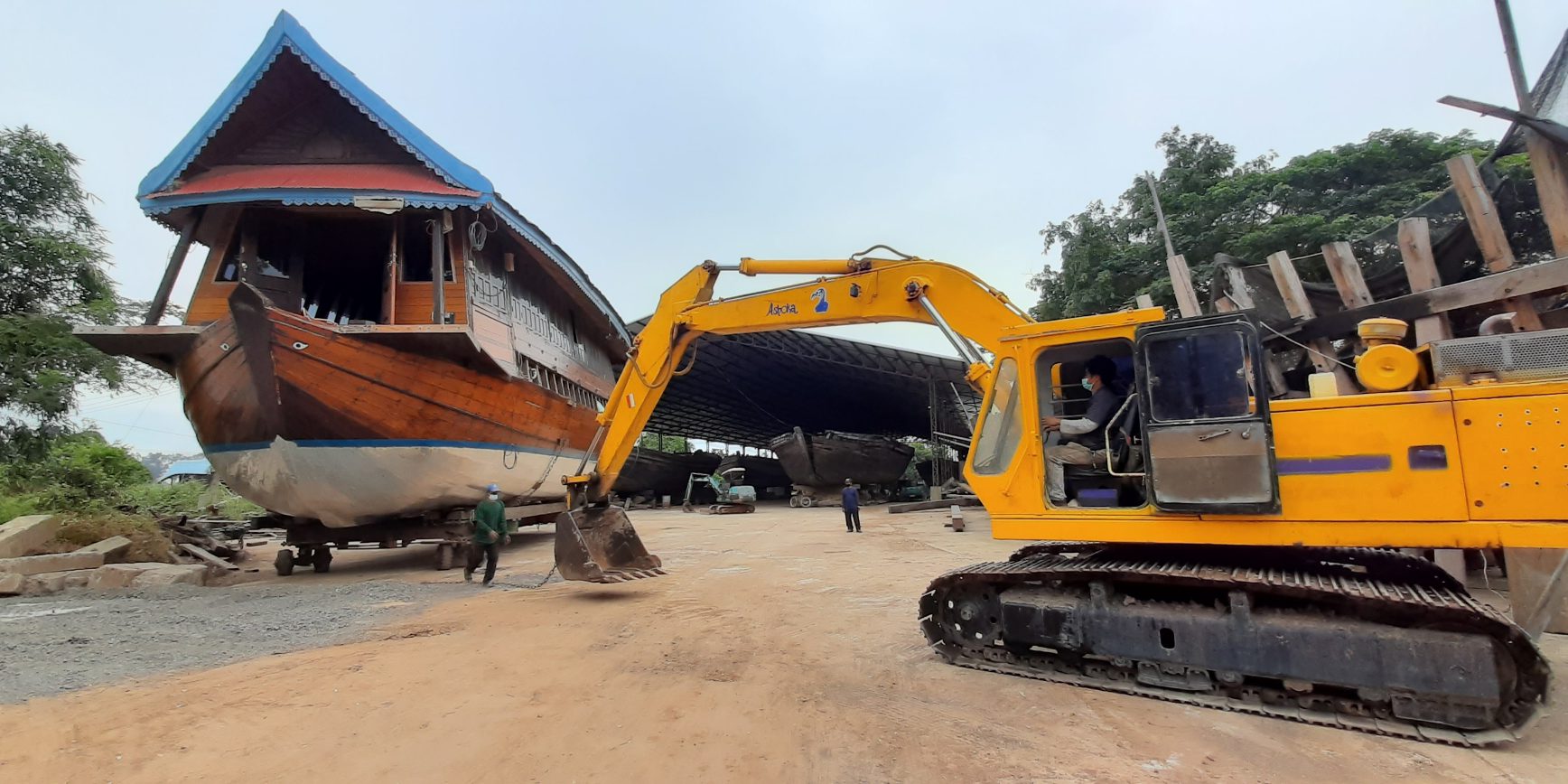 เมื่อเวลา13.00-15.45 น. วันนี้ วันที่ 15 พฤศจิกายน 2563 ที่บริเวณลานซ่อมโครงเรือ ใกล้ลานเบิ่งฟ้าประมาณเที่ยงถึงบ่ายกว่าๆ มีการนำเรือกระแชงของพ่อท่านเก่าลงบุ่ง ชื่อเรือเท้าแถนพญามูล ลงบุ่ง ซึ่งหลังจากซ่อมแซม ปรับปรุงเป็นที่เรียบร้อย ก็ถึงเวลาเคลื่อนลำเรือกระแชงลำนี้ลงสู่บุ่ง มีขนาดกว้าง 7 เมตร ยาว 18 เมตร หนักประมาณ 20 ตัน ทำจากวัสดุจากไม้ทั้งลำ เป็นศิลปะโบราณ ซึ่งบรรพบุรุษของเราสร้างด้วยฝีมือประณีต มีความแข็งแรง คงทน มั่นคง มีอายุใช้งานกว่า1 ชั่วอายุคน ต่อมาภายหลังพื้นท้องเรือชำรุดมาก จึงเสริมด้วยแผ่นอลูมิเนียมชนิดแข็ง พร้อมกับวัสดุคงทนเข้ามาช่วยเสริมให้เกิดความแข็งแรงมากยิ่งขึ้น โดยทีมอนุรักษ์เรือไทยจากบวรราชธานีอโศก ที่มุ่งมั่น พากเพียรด้วยความยินดี เต็มใจ ตั้งใจให้สำเร็จมาได้ด้วยดี เรือลำใหญ่ก็สามารถเคลื่อนได้ใช่คนเพียง 4 คนเท่านั้นใช้รถแม็คโครส่งแรงยกเรือกระแชงขึ้นบนรถสาลี่ค่อยๆเคลื่อนอย่างช้าๆด้วยความระมัดระวังด้วยเวลา 3 ชั่วโมงเศษการขนย้ายลงก็สำเร็จไปได้ด้วยดี ลำเลียง พยุงลำเรือลงบุ่งก็เผชิญกับปัญหาบ้าง ต้องพยายามตั้งหัวเรือ ตัวเรือให้ตรง แล่นไปทิศข้างหน้าให้พอดีกันอย่างช้าๆๆ น้ำหนักไม่เอียงข้างใดข้างหนึ่งเกินไป ก็เคลื่อนคู่ขนานกับการหยุดเป็นระยะๆ สลับกับการยกหมอนไม้รองล้อรถสาลี่เป็นระยะ สุดท้ายก็ได้พลังกาย พลังใจ ที่ผสานกันเป็นหนึ่งเดียว เรือจึงลงสู่บุ่งได้อย่างปลอดภัย