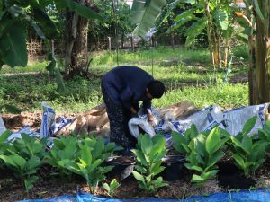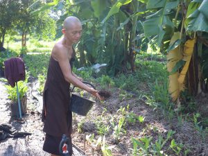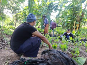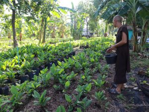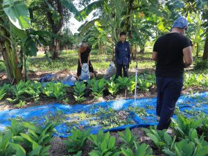เมื่อเช้าวันที่ 2 กรกฎาคม 2564 ทีมนิสิตวนบ.(มหาวิชชารามนาวาบุญนิยม) เป็นนักศึกษาผู้ปฎิบัติธรรมของชาวอโศกที่มีชีวิตอยู่กับการทำงานในชีวิตประจำวัน ครั้งนี้ได้มีโอกาสไปร่วมด้วยช่วยกันที่แปลงกระชาย ที่สวน 204 ในพื้นที่หมู่บ้านกุดระงุม ซึ่งเป็นพื้นที่กสิกรรมไร้สารพิษอีกแห่งหนึ่ง ชาวเราได้ปลูกหลากหลายชนิดในพื้นที่นี้ อย่างวันนี้ก็ได้มาช่วยกันถอนหญ้าออก ใส่ปุ๋ย ซึ่งมีท่านสิกขมาตุเป็นหญิง อโศกตระกูลเป็นแม่ฐานงาน ท่านได้ปลูกกระชายไว้เมื่อราวๆเดือนเมษายน ที่ผ่านมา ถึงตอนนี้ได้เข้าเดือนที่สี่แล้่ว คาดว่าจะเก็บผลผลิตกระชาย ใช้เวลาถึง 9 เดือน สมาชิกวันนี้ราวๆ10 คน ท่านเน้นการสอน ด้วยประสบการณ์จริงจากการลงมือทำ ลำดับแรกท่านจะให้ความสำคัญกับการบำรุงดินให้อุดมสมบูรณ์ก่อน ณ ที่ดินนี้ ท่านบอกว่าลองลงกระชายไปศึกษาไป ทำเกษตรอย่าเอาแต่ใจตนเอง ต้องคิดก่อนว่าเราจะให้อะไรดิน เคารพฟ้าเคารพดิน อย่าคิดจะเอาจากดิน เราให้ดิน เดี๊ยวดินก็ให้เราเอง โดยเฉพาะเรื่องใส่อินทรีย์วัตถุที่เป็นมิตรต่อสิ่งแวดล้อม ทำอย่างไรให้กลบหญ้าได้ จึงใช้ฟางกลบ ต่อมาไก่ก็เข้ามาคุ้ยดิน หมาก็เข้ามารบกวน มดแดง ไรที่มากับฟางอีก ดินเป็นกรด ปลูกอะไรก็จะเหลืองท่านจึงทดลองแล้วทดลองอีก ช่วงแรก ยังไม่ได้ปูพื้นดิน ยังไม่ค่อยร่วนซุย ต่อมาใช้ปุ๋ยงอกงามลงไป ทำให้ดินร่วนซุย กลุ่มญาติธรรมต่างก็มาช่วยเป็นระยะๆ ซึ่งสม.เป็นหญิงก็นับว่าเป็นหัวเรือใหญ่ในการปลูกกระชายที่แปลงนี้ แต่ละคนที่มาช่วยในเช้าวันนี้ ก็ได้ทั้งประโยชน์ตนประโยชน์ท่านไปพร้อม
